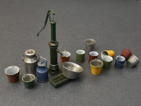 Kit contains 52 parts for assembling models of Buckets, Cans, Washbowl and Water Pump.