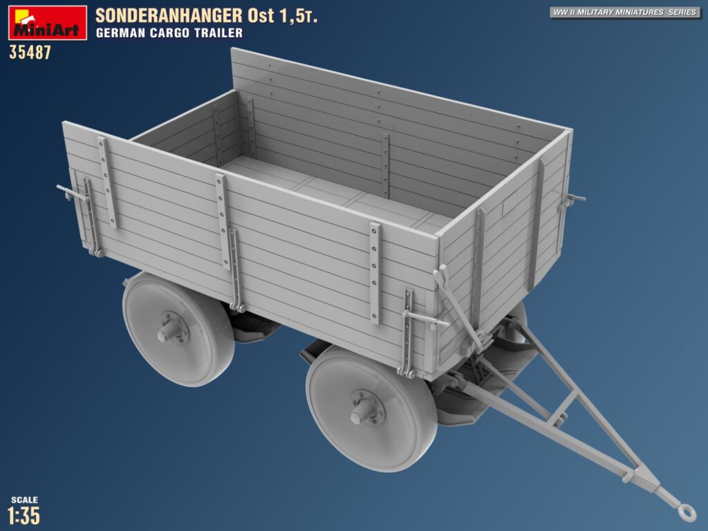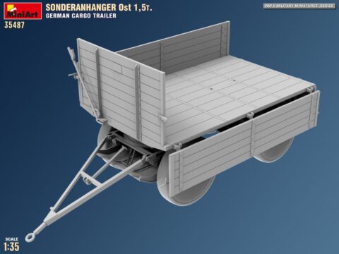 German cargo trailer widely used on the Eastern Front. This Scale 1:35 model accurately reproduces the Sonderanhänger Ost 1,5t., with attention to the wooden construction and wartime field camouflage.