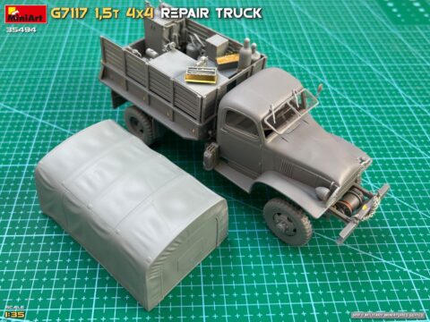 This 1:35 scale plastic model kit accurately recreates the G7117 1.5t repair truck, a vital support vehicle used during WWII. The detailed kit features the truck’s functional workshop interior with tools and equipment. Photo-etched parts enhance the realistic details, and the included decal sheet offers multiple marking options. The model captures the character of this mobile repair unit, complete with its distinctive cab and cargo bed filled with workshop.
