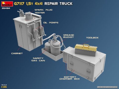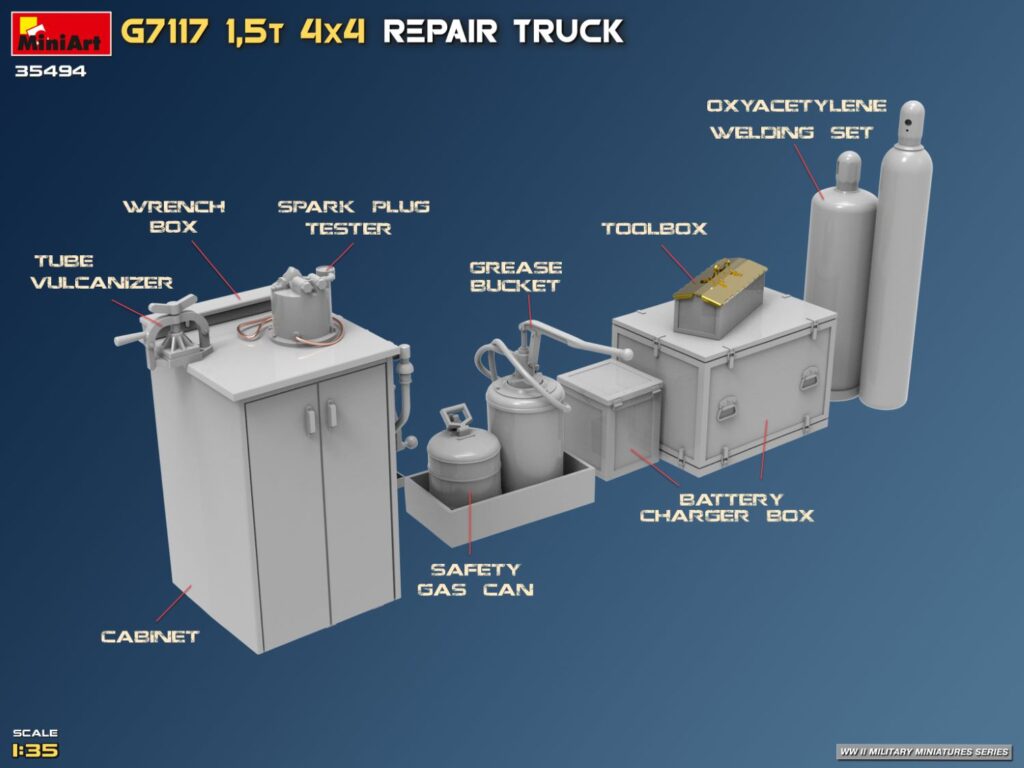 The perfect kit for any civilian or military diorama, this workshop set brings authentic detail and realism to your scenes. Filled with tools, storage cabinets, compressors, oil drums, welding equipment, and more.