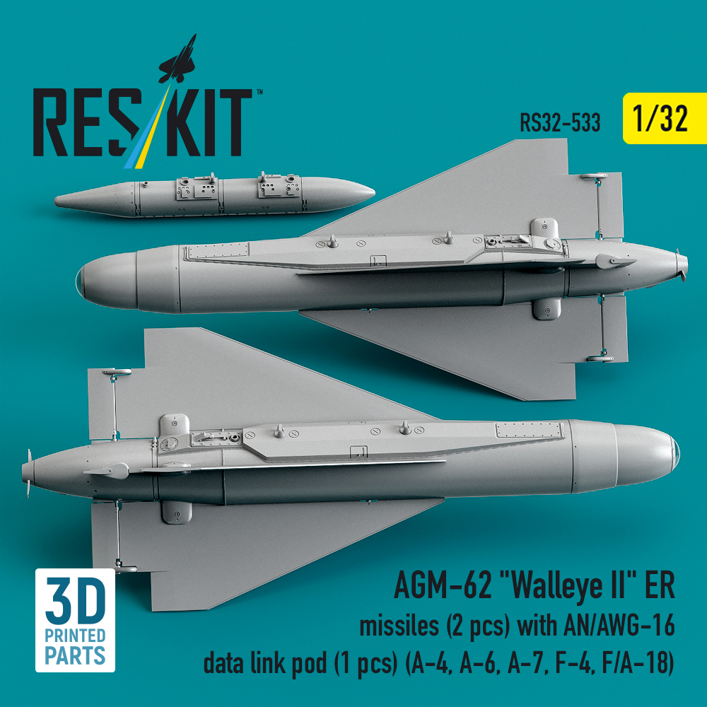 Reskit AGM-62 “Walleye II” ER missiles (2 pcs) with AN/AWG-16 data link pod (1 pcs) (A-4, A-6, A-7, F-4, F/A-18) (3D Printed) (1/32)