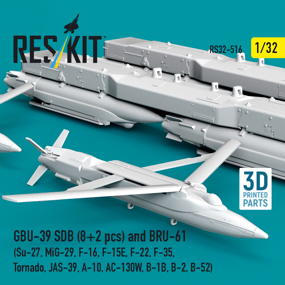 ResKit GBU-39 SDB (8 pcs) and BRU-61 (2 pcs) (Su-27, MiG-29, F-16, F-15E, F-22, F-35, Tornado, JAS-39, A-10, AC-130W, B-1B, B-2, B-52) (3D Printed) (1/32) RS32-0516